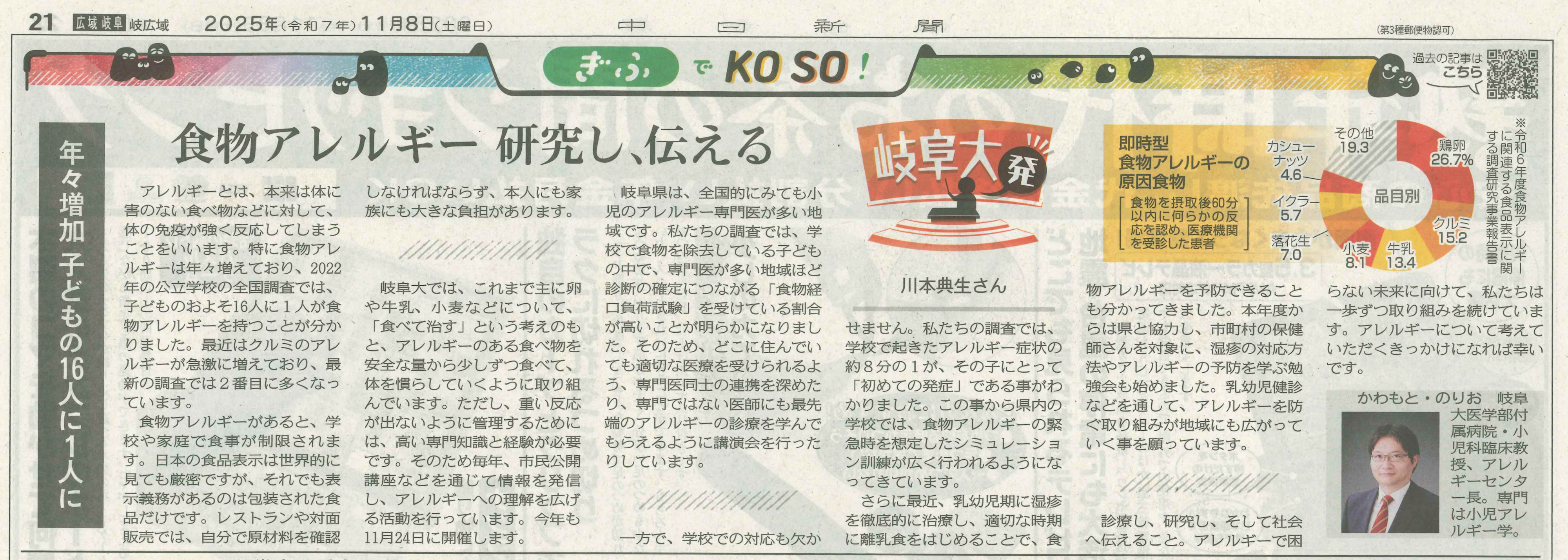 11/8(土)の中日新聞の「岐大発」のコーナーでアレルギーセンターの活動をご紹介頂きました。Webサイトでの公開を許可していただきましたので、ここに掲載致します。