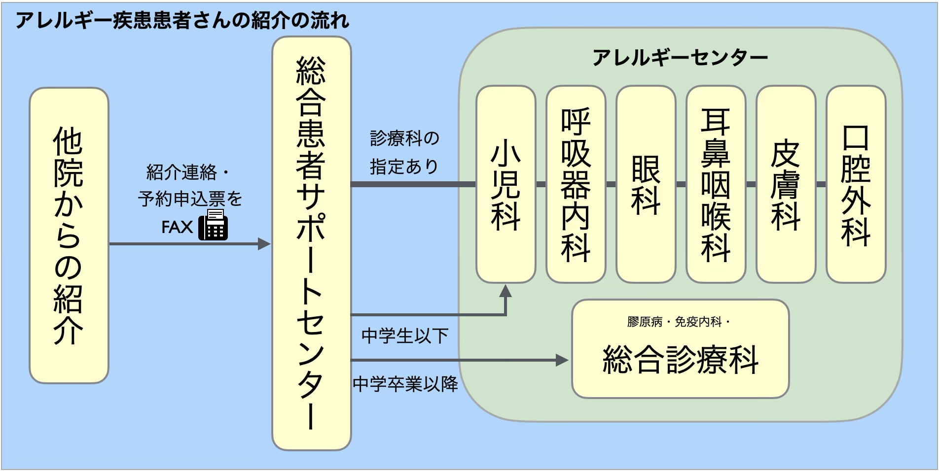 アレルギー疾患に対する診療は、これまで通り各専門科で行っています。専門科が明確でない場合には、小児においては小児科、成人においては総合内科で対応を行います。