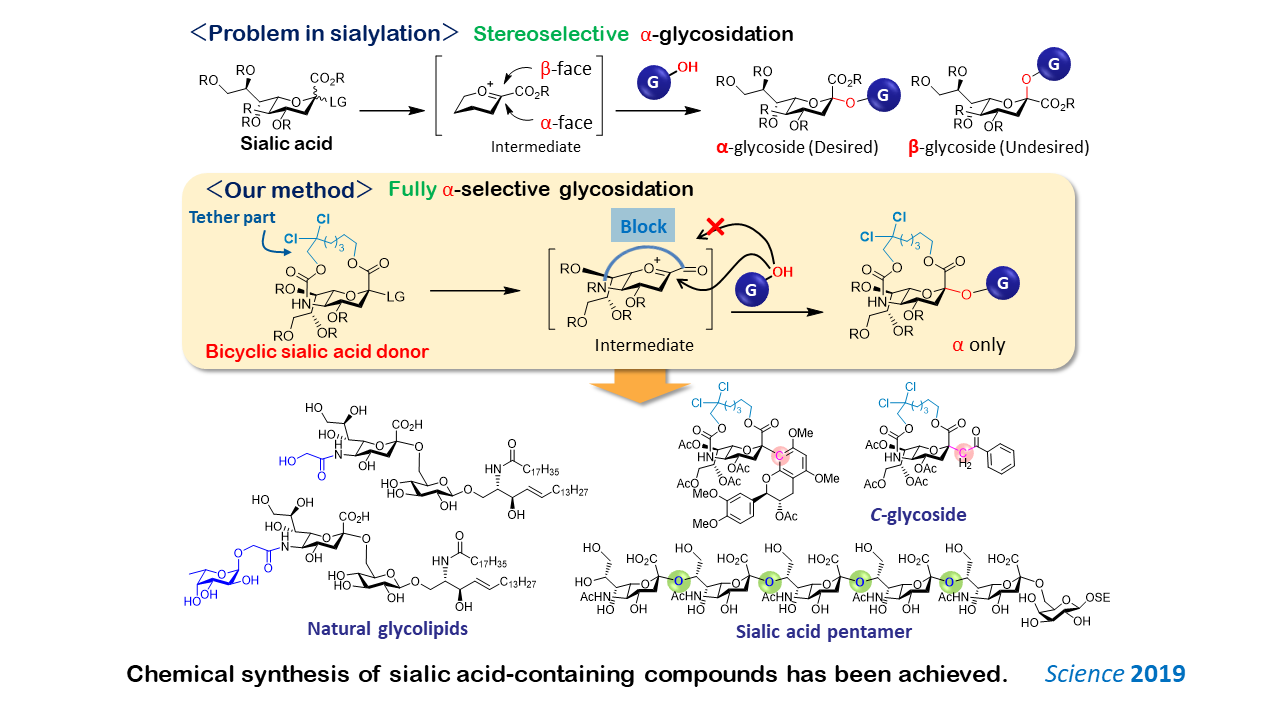 Sialic acid-containing glycans on the cell surface play an important role in cell-cell communication. Conversely, sialic acid is an important target for drug development because bacteria and viruses bind to the sialic acid-containing glycans. Sialic acid binds to other molecules through two types of linkages: α- and β-linkages. However, only α-linked sialic acid exists in nature. The chemical synthesis of α-sialosides has been a challenge in carbohydrate chemistry for 50 years. We have first achieved a fully stereoselective α-glycosidation of sialic acid by using a bicyclic donor, in which the β-face of sialic acid is blocked by the tether moiety. This method enables the synthesis of sialic acid linked not only to an oxygen atom (O-glycoside) but also to a carbon atom (C-glycoside), which is useful for vaccine development. Furthermore, we have achieved the chemical synthesis of glycolipids and sialic acid oligomers, which are difficult to synthesize with conventional methods.
