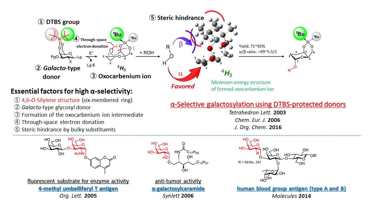 Precise control over the stereochemistry at the anomeric position (α and β) is essential for the chemical synthesis of glycans. To achieve this, highly stereoselective glycosylation reactions are required. However, α(1,2-cis)-selective glycosylation remains one of the most challenging issues in glycochemistry, as no broadly applicable and reliable methodology has been fully established. To address this, we designed a galactosyl donor bearing a di-tert-butylsilylene (DTBS) group at the C4- and C6-positions. Glycosylation using this donor afforded α-galactosides in high yield and excellent stereoselectivity–a phenomenon referred to as the “DTBS effect”. Using this original approach, we have successfully constructed α-galactose-containing structures in a variety of bioactive glycans. Furthermore, to elucidate the detailed reaction mechanism, we are combining experimental techniques with computational chemistry in collaborative research.
