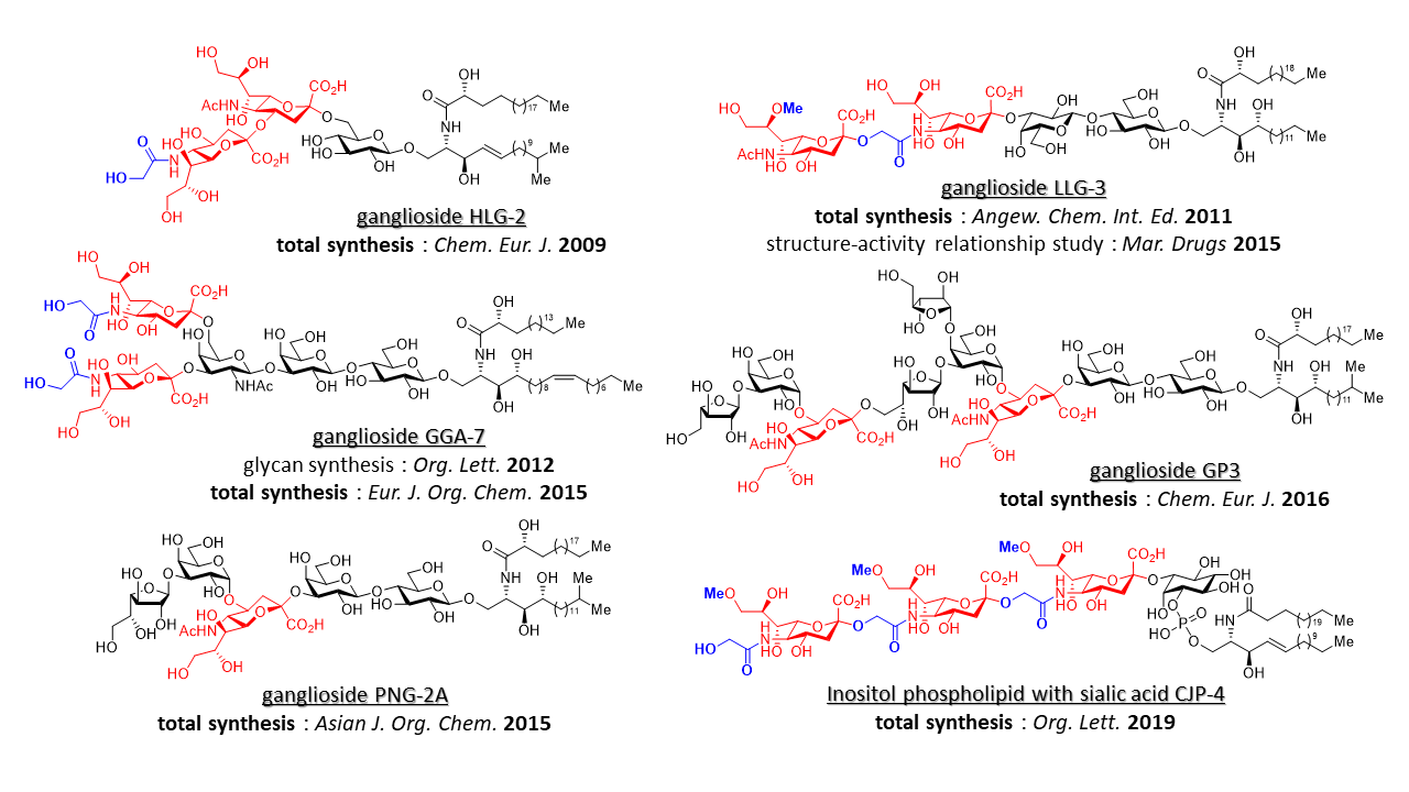 Sialic acid-containing glycolipids isolated from echinoderms, such as sea cucumber and starfish, have been reported to exhibit potent neurite outgrowth activity. Unlike mammalian gangliosides, these glycolipids feature internal sialic acid residues and unique chemical modifications including N-glycolylation and O-methylation, which makes them intriguing not only from a biological perspective but also as synthetic targets. In response to this, we undertook the total synthesis of echinoderm-derived sialic acid-containing glycolipids using glycosylation and synthetic methodologies originally developed in our laboratory. As a result, we have successfully achieved the total synthesis of the following compounds.