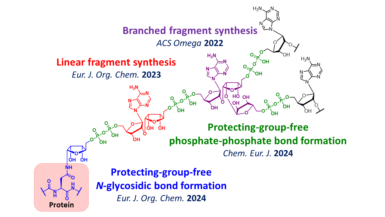 ADP-ribose chains are biomolecules that, like glycans, are attached to proteins as a form of post-translational modification and play a crucial role in DNA damage repair. In addition to their biological significance, they possess structural features of both glycans and nucleic acids, making them highly attractive synthetic targets. To achieve the controlled synthesis of ADP-ribose chains, we have established synthetic methods for linear and branched fragments based on techniques in carbohydrate chemistry. Furthermore, we have developed novel methods to efficiently form the phosphate-phosphate bond and the reducing-end N-glycosidic bond found in ADP-ribose chains. By using these synthetic methods, we are advancing ADP-ribose chain chemical biology research.
