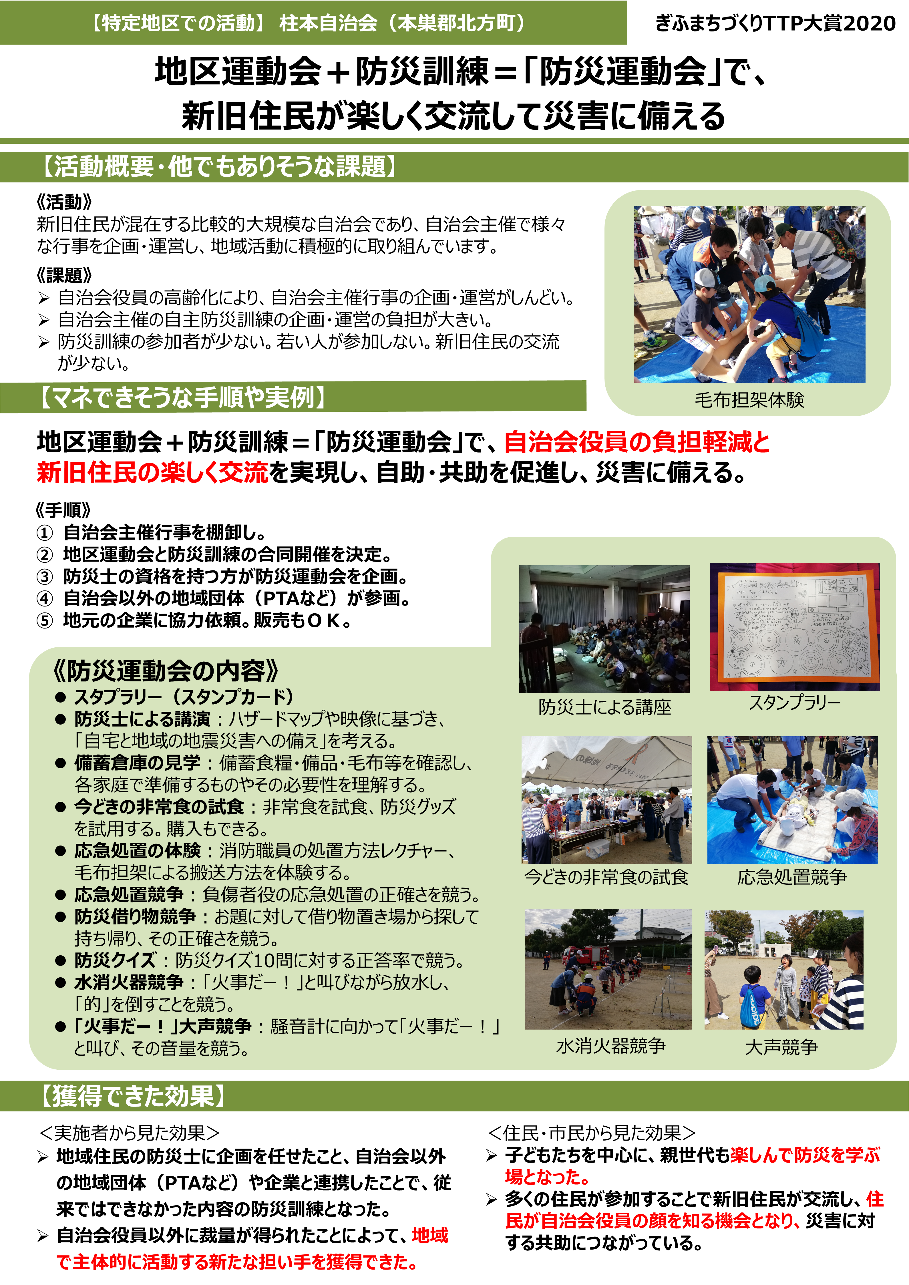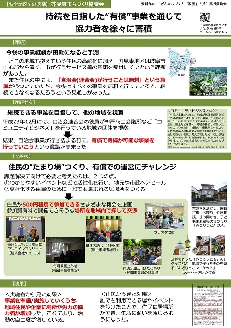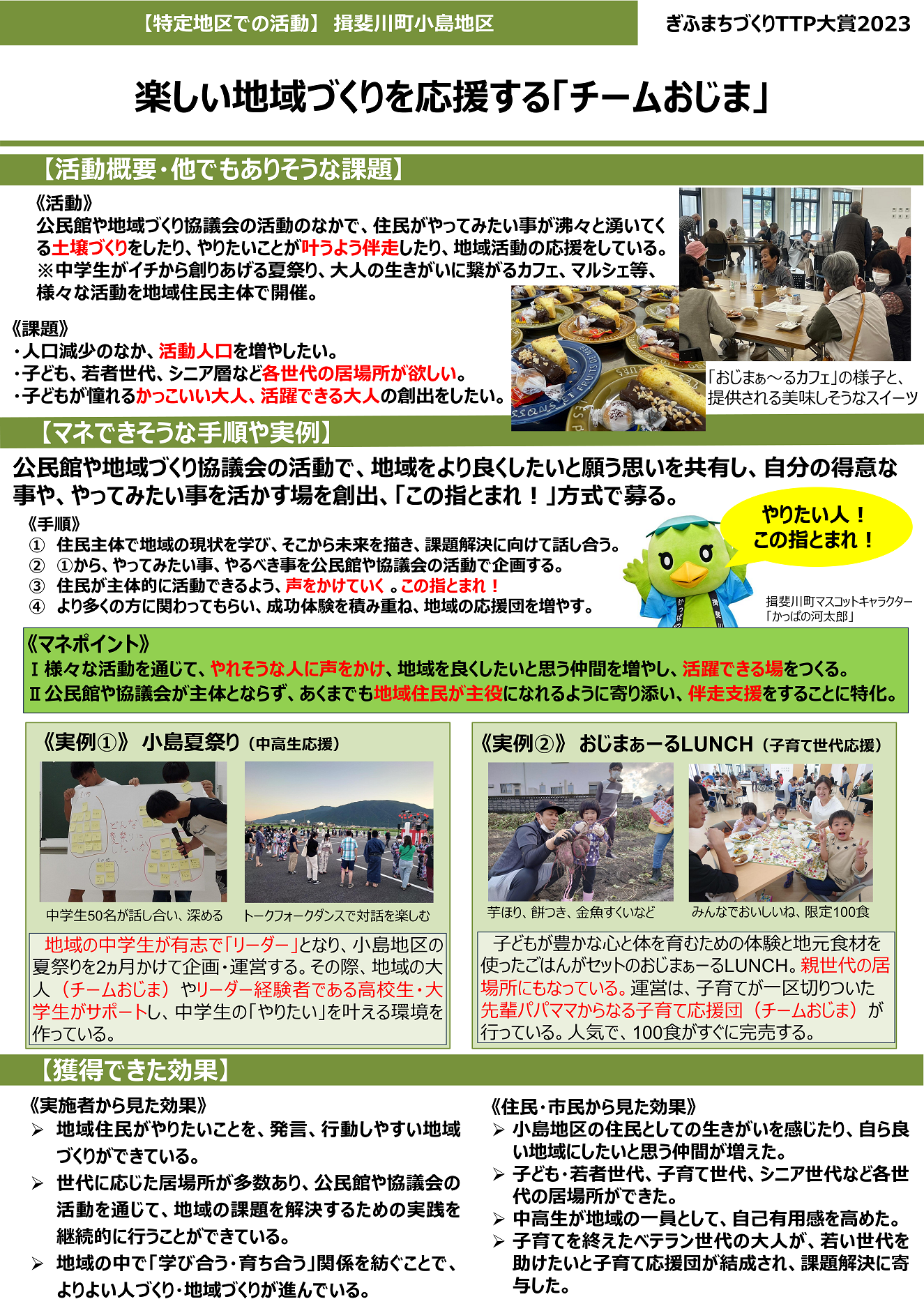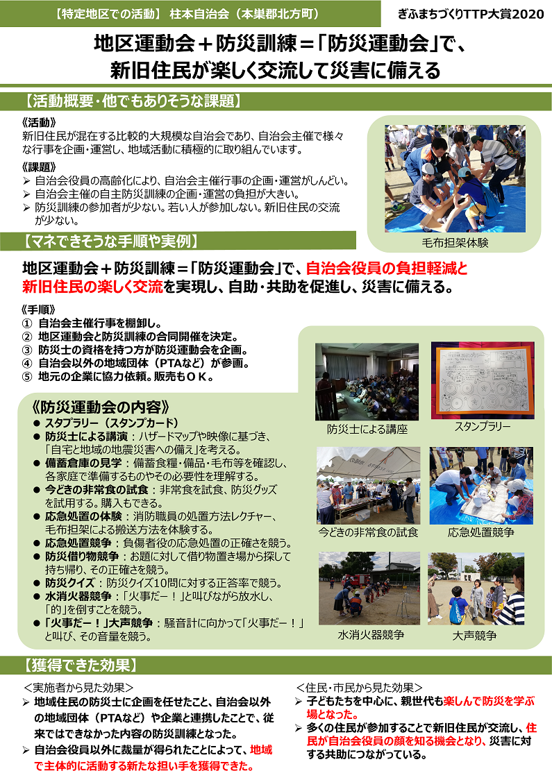 | 長良東自治会連合会(岐阜市) | 柱本自治会(本巣郡北方町) | 地域づくりNPO「山県楽しいプロジェクト」 |