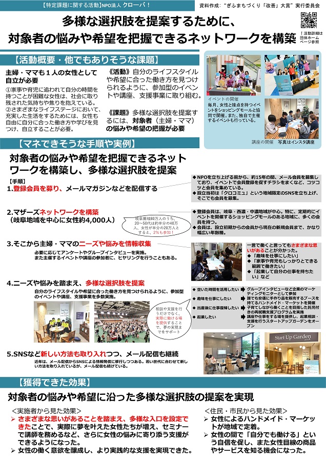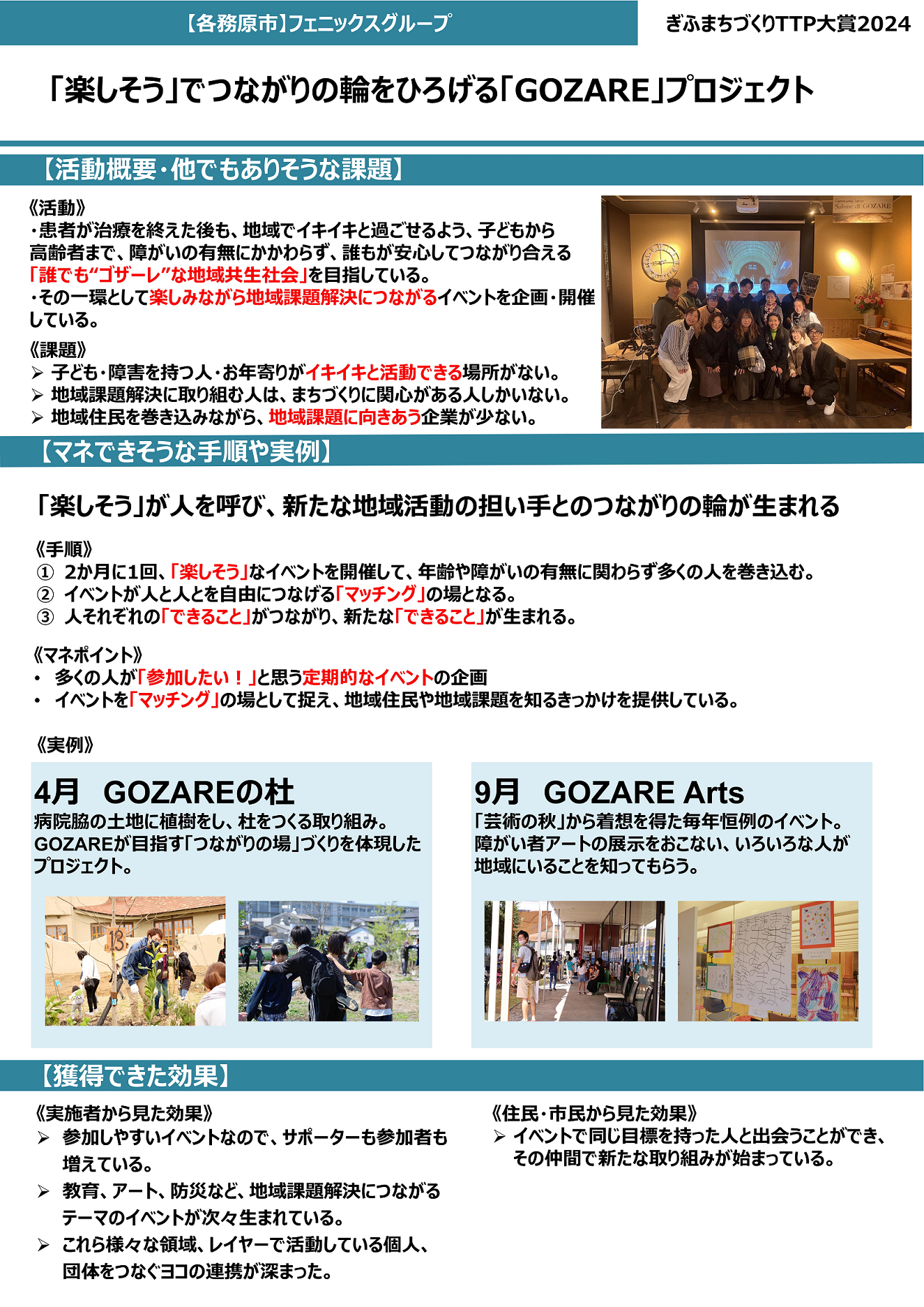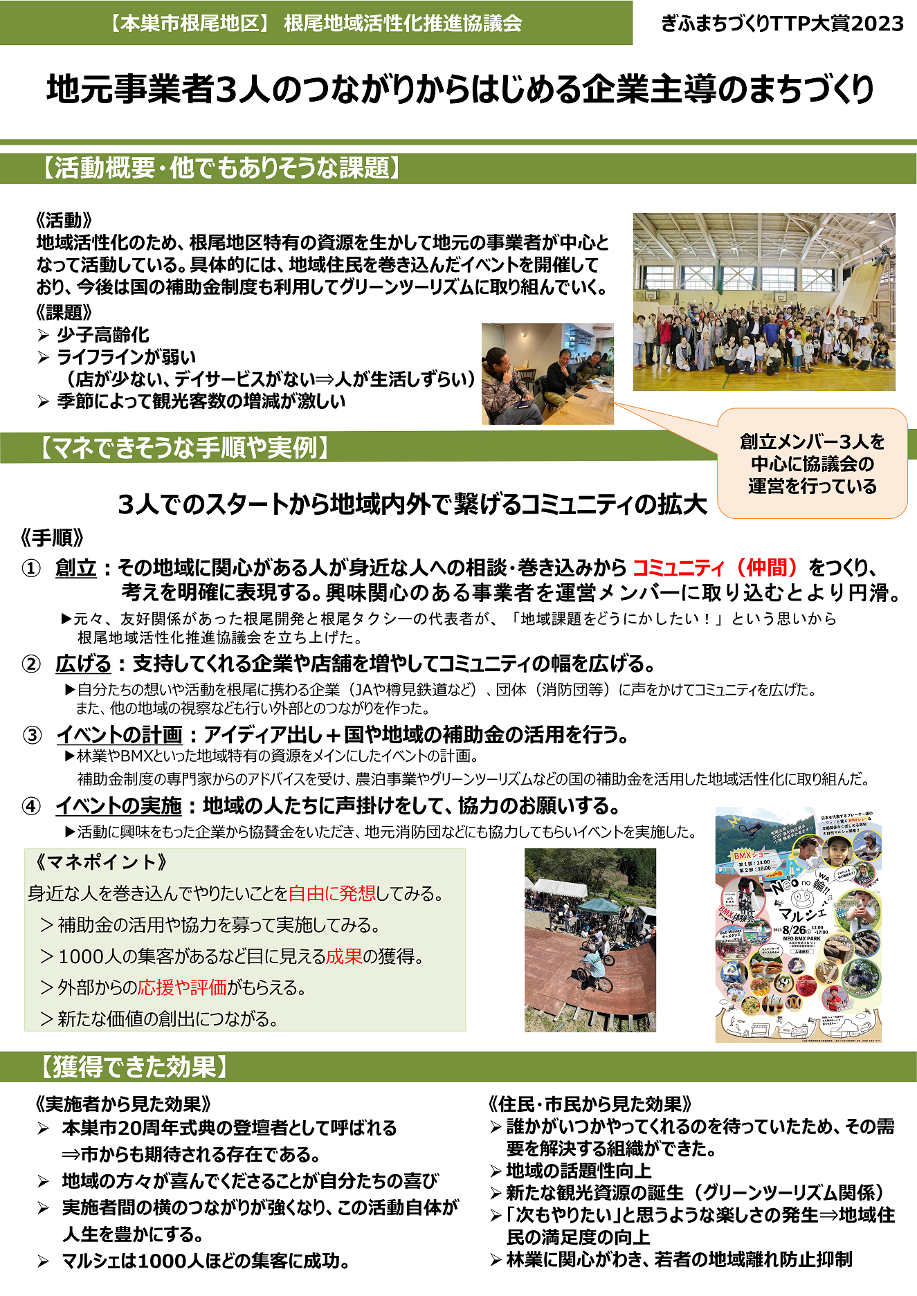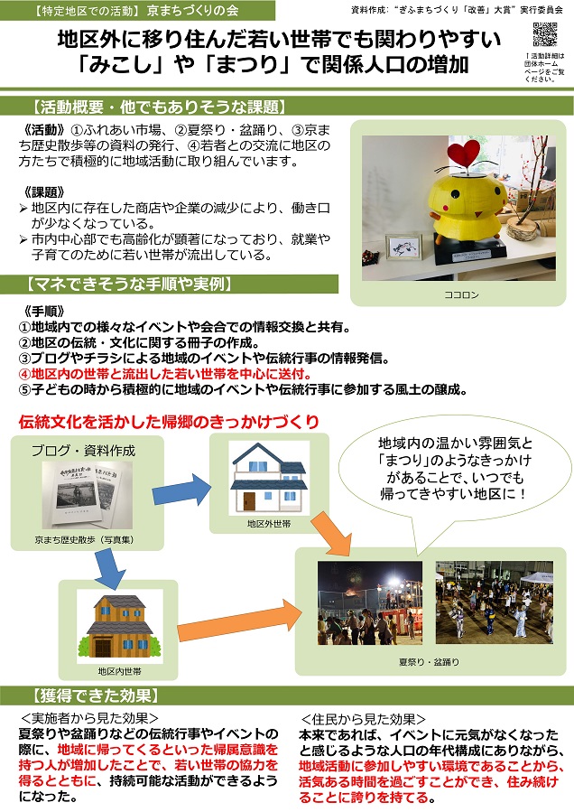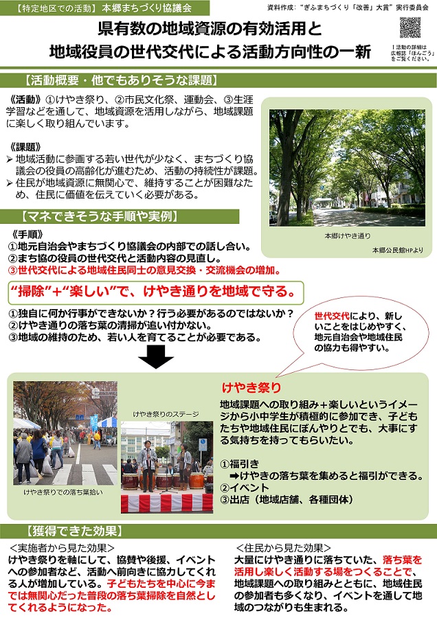 | 長良東自治会連合会(岐阜市) | 柱本自治会(本巣郡北方町) | 地域づくりNPO「山県楽しいプロジェクト」 |