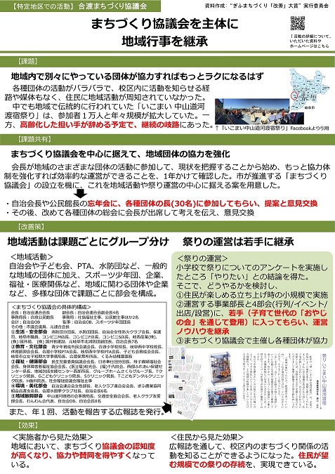 | 「自治会長も知らない自治会のコトを伝える広報紙」 | 「地区運動会+防災訓練=『防災運動会』で、 新旧住民が楽しく交流して災害に備える」 |