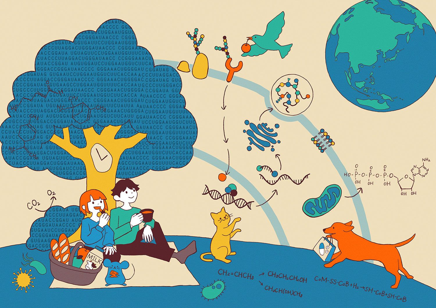 このオリジナルイラストには,応用生命化学科で行われている研究に関連したモチーフ(キャラクター)が描かれています。それぞれ関連する研究室のウェブサイトにリンクしています。