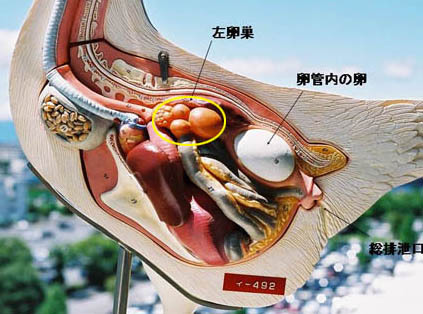 ○で囲んだ部分が卵巣で,一個一個の黄色いものが卵胞。