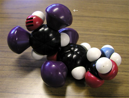 紫色がヨウ素。矢印のヨウ素が水素になっているものがT3。その他の原子は黒が炭素,白が水素,青が窒素,赤が酸素。