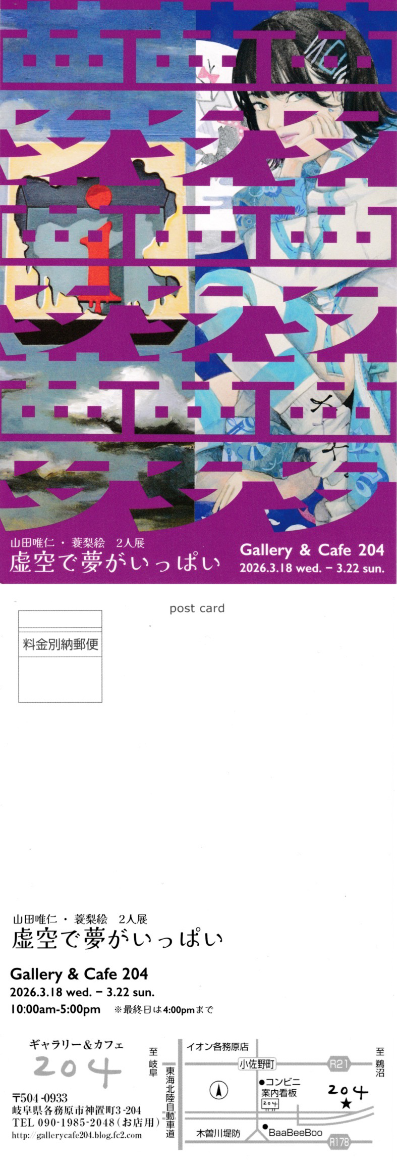 2026年3月18日から22日まで、山田助教と卒業生・現職教員との二人展「虚空で夢がいっぱい」が各務原市のギャラリー&カフェ204で開催されます。