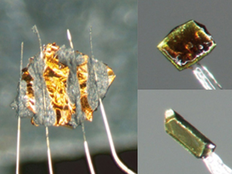 構造解析や物性測定用の固体試料です。非常に魅力的な色を呈しています。単結晶に金ワイヤーを張り付けたりします。