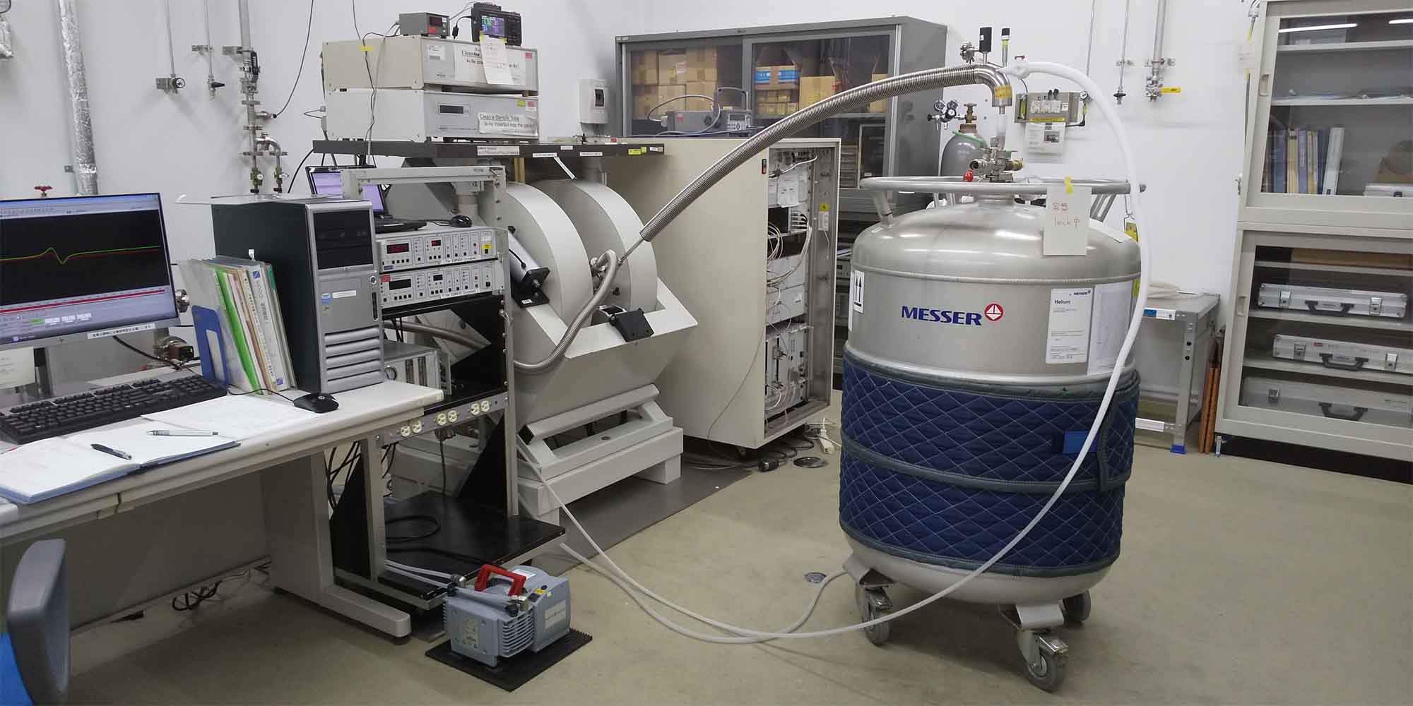 岡崎にある分子科学研究所の装置をお借りして、極低温(2K)からの磁化率を測定します。この部屋に籠ると、不思議に落ち着きます。 -