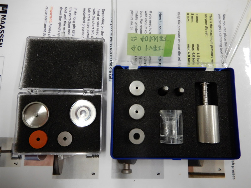 1mm、3mm、5mmのダイセットがあります。物性測定のため、微結晶を押し固めてペレットにします。 -