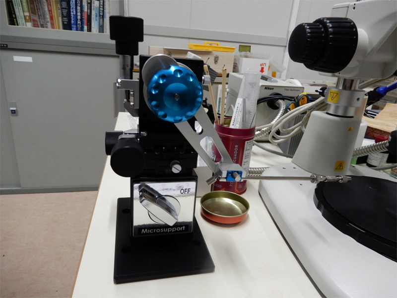 単結晶が非常に小さいので、マニュピレータの力を借ります。 -