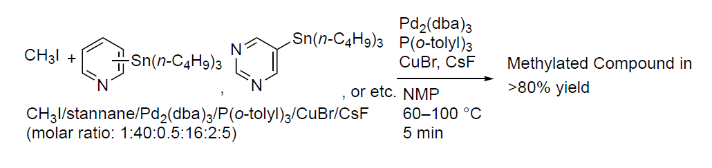 Pd⁰-mediated rapid coupling between methyl iodide and heteroarylstannanes: an efficient and general method for the incorporation of a positron-emitting ¹¹C radionuclide into heteroaromatic frameworks; M. Suzuki, K. Sumi, H. Koyama, Siqin, T. Hosoya, M. Takashima-Hirano, H. Doi, Chem. Eur. J. 15, 12489-12495 (2009).