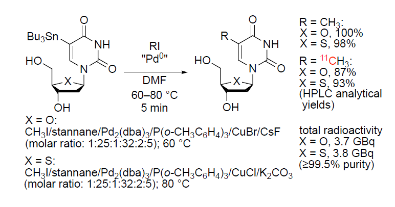 Highly efficient syntheses of [methyl-¹¹C]thymidine and its analogue 4’-[methyl-¹¹C]thiothymidine as nucleoside PET probes for cancer cell proliferation by Pd⁰-mediated rapid C-[¹¹C]methylation; H. Koyama, Siqin, Z. Zhang, K. Sumi, Y. Hatta, H. Nagata, H. Doi, M. Suzuki, Org. Biomol. Chem. 9 (11), 4287-4294 (2011).