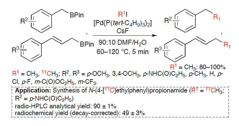 Pd⁰-mediated rapid coupling of methyl iodide with excess amounts of benzyl- and cinnamylboronic acid estsers: Efficient method for incorporation of positron-emitting ¹¹C radionuclide into organic frameworks by coupling between two sp³-hybridized carbons; H. Koyama, Z. Zhang, R. Ijuin, Siqin, J. Son, Y. Hatta, M. Ohta, M. Wakao, T. Hosoya, H. Doi, M. Suzuki, RSC Advances 3(24), 9391-9401 (2013).