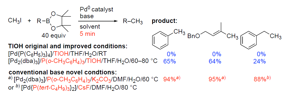 Evaluation of TlOH effect for Pd⁰-mediated cross-coupling of methyl iodide and excess boronic acid ester toward fabrication of [¹¹C]CH₃-incorporated PET tracer; H. Koyama, H. Doi, M. Suzuki, Int. J. Org. Chem. 3, 220-223 (2013).