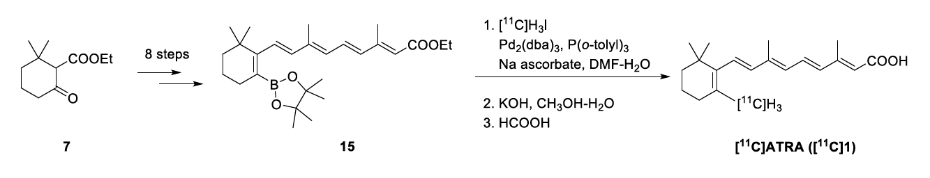 Synthesis of ¹¹C-labeled retinoic acid, [¹¹C]ATRA, via an alkenylboron precursor by Pd(0)-mediated rapid C-[¹¹C]methylation; M. Suzuki, M.Takashima-Hirano, H. Ishii, C. Watanabe, K. Sumi, H. Koyama, H. Doi, Bioorg. Med. Chem. Lett. 24, 3622-3625 (2014).