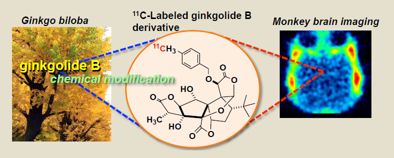 Blood-brain barrier permeability of ginkgolide: Comparison of the behavior of PET Probes 7α-[¹⁸F]fluoro- and 10-O-p-[¹¹C]methylbenzyl ginkgolide B in monkey and rat brains, Hisashi Doi, Kengo Sato, Hideo Shindou, Kengo Sumi, Hiroko Koyama, Takamitsu Hosoya, Yasuyoshi Watanabe, Satoshi Ishii, Hideo Tsukada, Koji Nakanishi, and Masaaki Suzuki, Bioorg. Med. Chem. 24, 5148-5157 (2016).