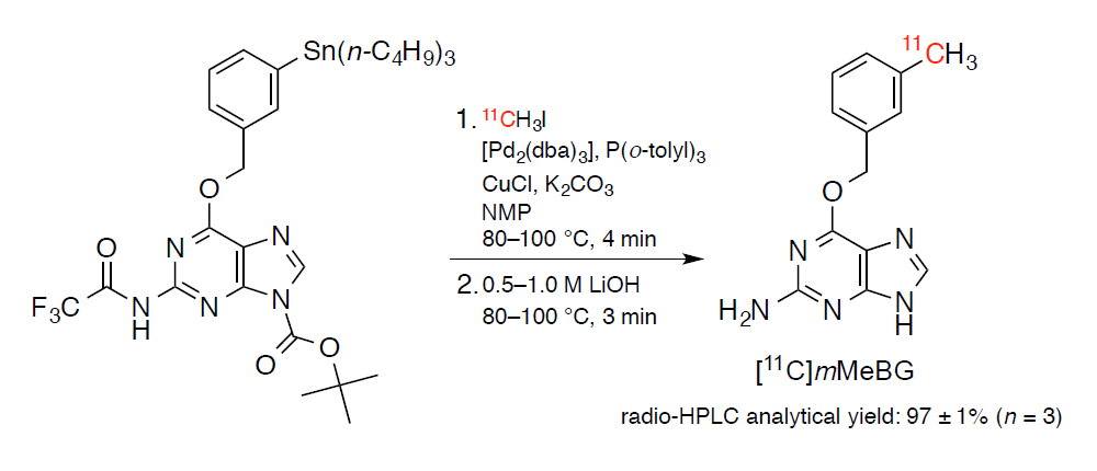 Synthesis of PET probe O⁶-[(3-[¹¹C]methyl)benzyl]guanine by Pd⁰-mediated rapid C-[¹¹C]methylation toward imaging DNA repair protein O⁶-methylguanine-DNA methyltransferase in glioblastoma, Hiroko Koyama, Hiroshi Ikenuma, Hiroshi Toda, Goro Kondo, Masaki Hirano, Masaya Kato, Junichiro Abe, Takashi Yamada, Toshihiko Wakabayashi, Kengo Ito, Atsushi Natsume, Masaaki Suzuki, Bioorg. Med. Chem. Lett. 27, 1892-1896 (2017).