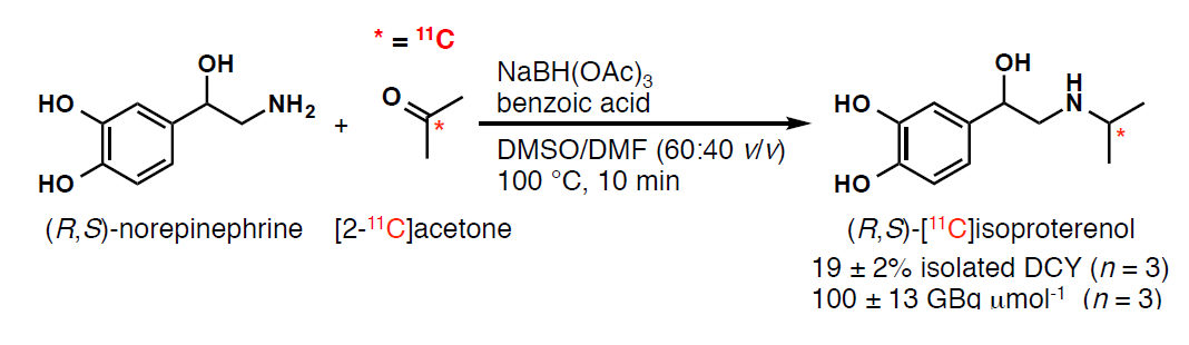 Synthesis of (R,S)-isoproterenol, an inhibitor of tau aggregation, as an ¹¹C-labeled PET tracer via reductive alkylation of (R,S)-norepinephrine with [2-¹¹C]acetone, Hiroshi Ikenuma, Hiroko Koyama, Naoya Kajino, Yasuyuki Kimura, Aya Ogata, Junichiro Abe, Yasuhiro Kawasumi, Takashi Kato, Akihiko Takashima, Kengo Ito, Masaaki Suzuki, Bioorg. Med. Chem. Lett. 29, 2107-2111 (2019).