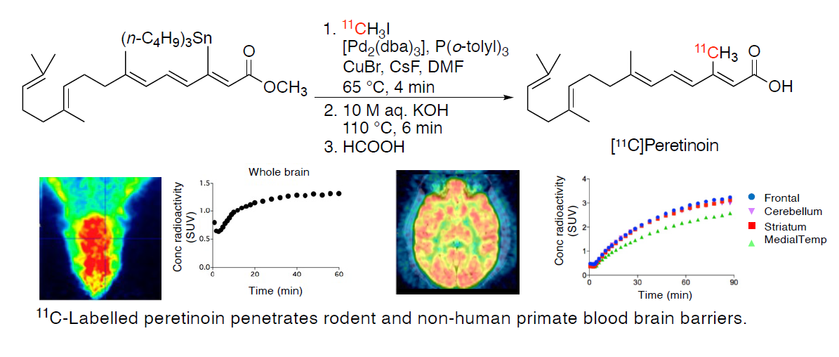 ¹¹C-labeling of Acyclic Retinoid Peretinoin by Rapid C-[¹¹C]Methylation to Disclose Novel Brain Permeability and Central Nervous System Activities Hidden in Antitumor Agent, Keiichi Suzuki, Hiroko Koyama, Narumasa Nakamura, Yasuyuki Kimura, Aya Ogata, Hiroshi Ikenuma, Hideki Ishii, Ming-Rong Zhang, Kazunori Kawamura, Takafumi Minamimoto, Yuji Nagai, Hiroshi Katsuki, Tetsuya Kimura, Nobuyuki Kimura, Masanori Ichise, Takasi Kato, Kengo Ito, and Masaaki Suzuki, Bioorg. Med. Chem. Lett. (2023) 85, 129212.