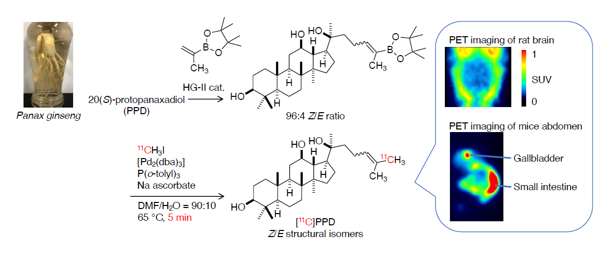 ¹¹C-Labeling of 20(S)-protopanaxadiol, an aglycon of ginsenoside, based on the use of Pd(0)-mediated rapid C-[¹¹C]methylation of boronic precursors. Y. Ooshima, H. Koyama, Aya Ogata, Hiroshi Ikenuma, Takashi Yamada, Hiroyuki Kojima, Takashi Kato, Y. Kimura, M. Suzuki, Bioorg. Med. Chem. Lett. 128, 130356 (2025).