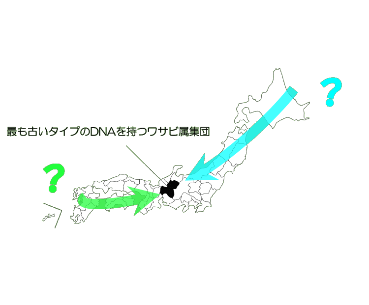 | 葉緑体DNAの塩基配列比較解析から、現在の日本に自生するワサビ属植物のなかで、もっとも古いタイプのDNAをもつ集団は岐阜県に存在していることが明らかになりました(山根投稿準備中)。岐阜県はご存知のとおり、『日本のおへそ』とも言われる日本のまんなか県です。前述したとおり、中国のワサビ属植物(E. yunnansense)との共通祖先とは、約500万年前に分化したことが明らかとなっています。では、その共通祖先と分かれた後、日本のワサビ属植物は、どのようなルートで日本へやってきたのでしょうか?我々は、わさびのきた道を、標本やDNA分析を用いて明らかにしようとしています。中国雲南省の昆明と北京の二箇所の全てのEutrema属の標本の調査から、Eutrema属全体の分布状況がわかりました。こうした情報に加え、日本国内のワサビ属植物の地域集団間の遺伝的な類縁関係を明らかにすることで、上図で示しましたとおり、ワサビは北方系ルートなのか、もしくは朝鮮半島経由なのかの結論が出せるものと考えています。伝播経路を知ることは、日本国内のワサビの遺伝的多様性がどのように形成されたのかを知ることにつながります。さらに過去500万年の間に起きた気候変動などから分布拡大のシュミレーションをすることで、逆に今後、地球温暖化などの影響を考えると、ワサビのような落葉広葉樹林帯の植物はどのような移動をするのかという将来予想をすることが可能になります。これらは保全に関しても有用な情報となります。 興味深いことに、アイヌでは、ワサビが用いられた記録がありません(山根投稿準備中)。ワサビの来た道と日本の植物利用文化との関連を調べることで植物の多様性が日本人の食文化に与えた影響を考察したいと考えています。(⇒民俗学的調査へ)
