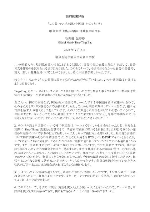 出前講義 岐阜聖徳学園大学付属中学校学/Lecture at Gifu Shotoku Gakuen University Junior High School (July 18,