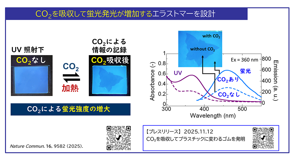 主要な温室効果ガスである二酸化炭素(CO2)の削減は社会的な課題です。現在、空気中からCO2を回収し、貯留、そして回収したCO2を有効活用する取り組みが世界中でおこなわれています。この様な背景のもと、私たちの研究室では、CO2に反応するユニークなポリマー材料の開発に取り組んでいます。これらの材料を使うことで、CO2を見つけたり、捕まえたり、そして捕まえたCO2を役立てたりすることができます。