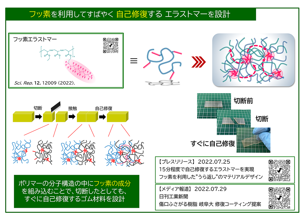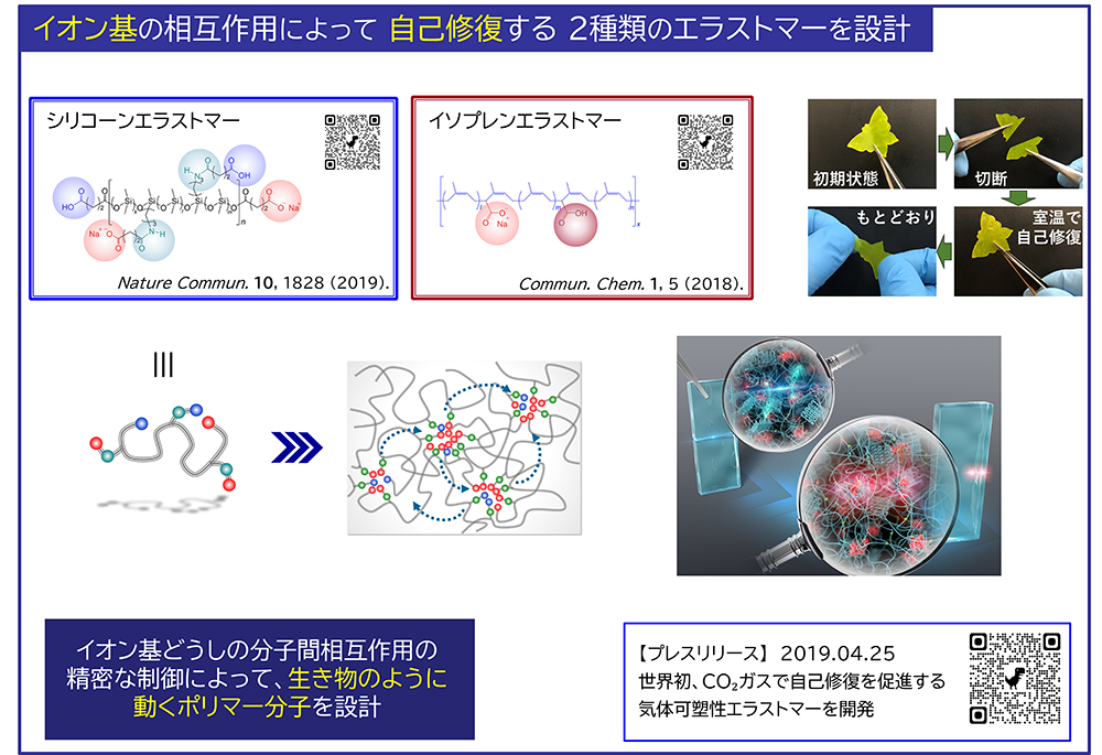 柔軟で弾力があり、伸縮性に富んだエラストマーは、自動車のタイヤをはじめ、日用品から医療、建材用途までひろく利用されています。まるで私たちの皮膚の様に柔軟なエラストマーですが、生物の皮膚とは違って人工物であるエラストマーは怪我をしても治りません。しかし、もしエラストマーの傷が自然に修復すれば、製品の破損の未然防止や、破損した製品の再利用などの様々なメリットが考えられます。また、製品をながく使用できるようになることで、大量生産・大量消費の悪循環から脱却し、環境問題やエネルギー問題の解決に貢献することが期待されます。私たちの研究室では、分子レベルからポリマーを設計し、自己修復する、つまり怪我の治るエラストマーについての研究に取り組んでいます。