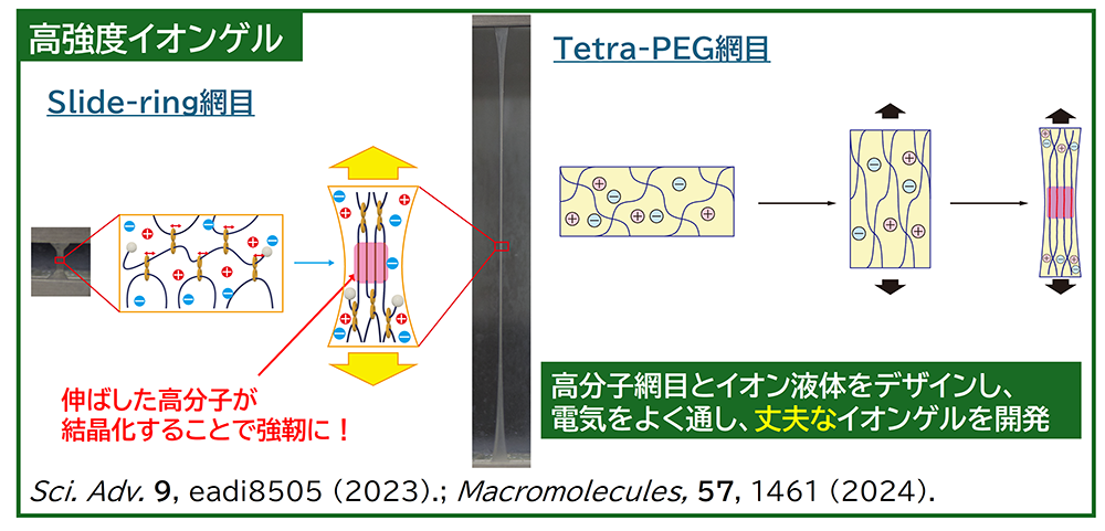 イオンゲルは、ゼリーのような一般的なゲルとは異なり、溶媒として不揮発性のイオン液体を含みます。そのため、乾燥せず電気を通すという特性を持った材料であり、ウェアラブルデバイスや次世代エレクトロニクスへの応用に向けて注目されています。従来のイオンゲルは脆弱で壊れやすいという課題がありましたが、当研究室では高分子網目の設計や溶媒の選択を通して、高強度なイオンゲルの創製を進めています。
