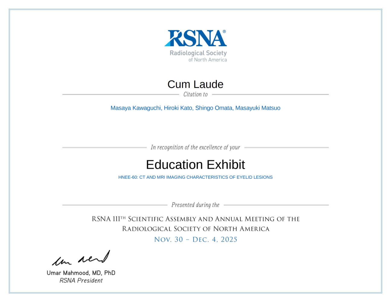 2025年11月30日から12月4日まで米国シカゴで開催されたRSNA(北米放射線学会)のEducation Exhibitにて、当科医局員(現:大垣市民病院 放射線診断科)の川口 真矢先生の発表(Tltle: CT And MRI Imaging Characteristics Of Eyelid Lesions)がCam Laudeを受賞しました。おめでとうございます!