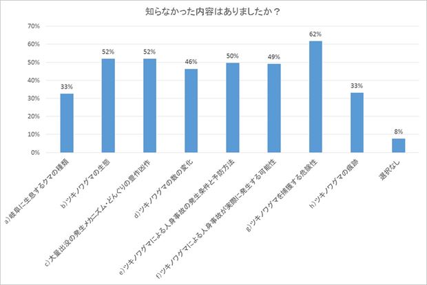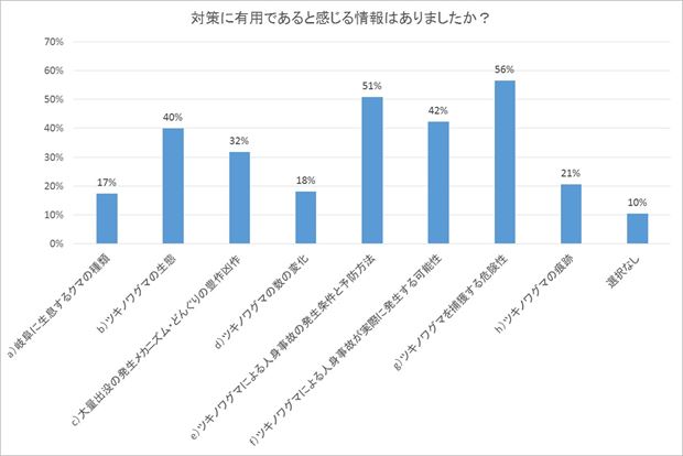 養老山周辺に発信機をつけた個体以外にも多くのツキノワグマが生息する可能性を伝えたにも関わらず、ツキノワグマの情報を得た多くの方が安心したと回答しています。住民が不安を感じるのは、相手に対する知識が不足しているからなのです。そして最も多くの方が、知らなかった情報・対策に有用だと答えた情報が、ツキノワグマを捕獲する危険性です。