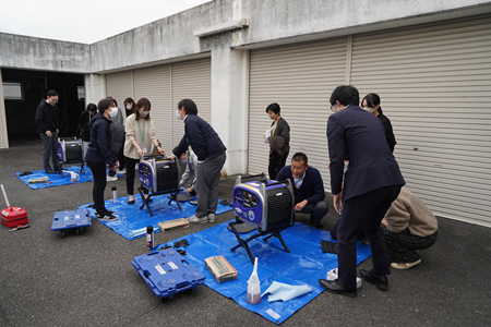 | 実施内容: | 業者から説明を受け、発電機の始動方法およびメンテナンス方法について、実機で実施 昨年度、発電機を部局に分散配備を行ったため、各部局で1年に1度、メンテナンスを実施していただけるよう、メンテナンスキットBOXを配付 |