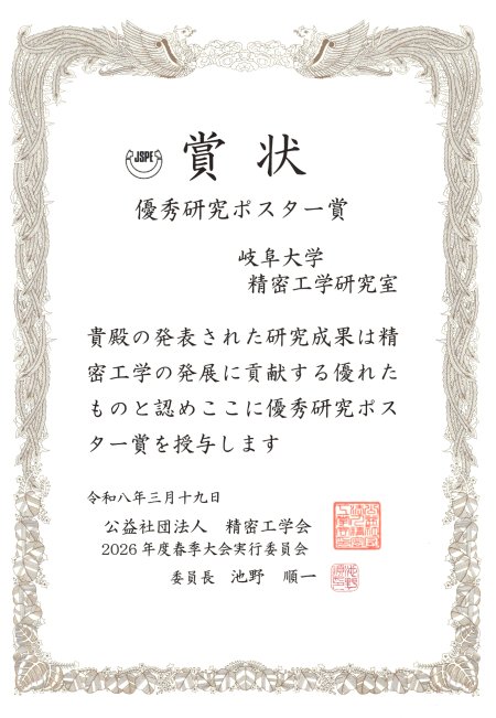 ![]() 2026年4月3日 嬉しいニュース (公社)精密工学会から「優秀ポスター賞」 なるものが届きました いつの間に審査されていたの???って感じ ありがとうございます 2026年4月2日 関鍛冶伝承館とのコラボ企画を公開しました ぜひご参加ください 対象者を高校生以上にしています ご了承のほどを 関鍛治伝承館の「X」で確認できます 大学ホームページにもアップしています ![]() (表面) ![]() (裏面) 2026年4月1日 研究室見学会用リーフレットを作成しました ぜひご覧ください ![]() 2026年4月1日 社会実装研究コア教授(兼務)を拝命しました マグネット式のSIRC(サーク)の看板をいただきました 居室の前に貼っておきます 2026年4月1日 いよいよ4月になりました〜 岐阜大学着任3年目 まだまだフレッシュな気分で頑張ります キャンパスの桜もまだまだ大丈夫 綺麗ですね〜 今日は9:30〜兼務する社会実装研究コア教授の 辞令交付式および懇談会です AIセンターと金型センターを加えて3つ目 まぁ社会実装研究コアがトップの新組織になるのかな 写真はアカデミックセントラルから 教育学部(確か・・・)へ行く通り道のところ 少しだけ葉桜の模様が・・・ 頑張れ〜 あんまり新しいスマホでは無いけど まだまだ綺麗に撮れますね | |