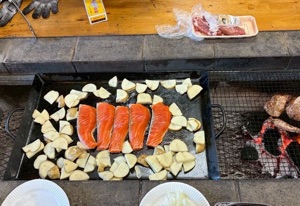 鮭のチャンチャン焼きに初トライ。北海道育ちの私(山本、5年住んだけですが)の目標は「打倒けいちゃん」。けいちゃんは郡上〜高山の郷土料理。